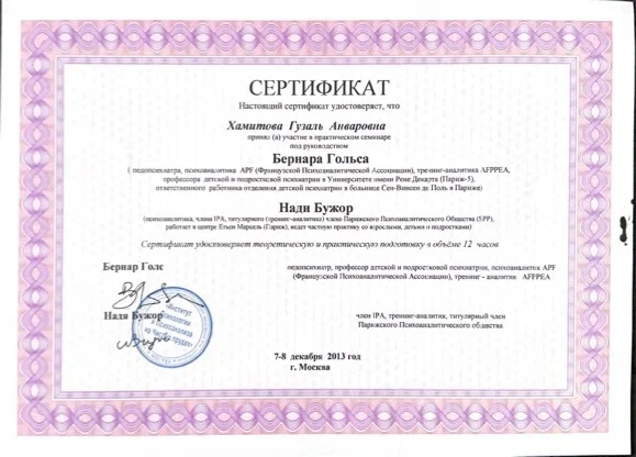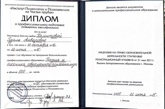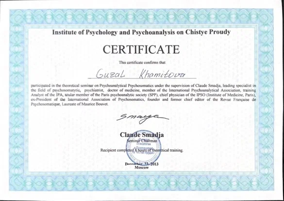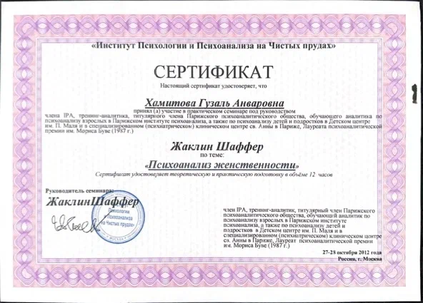 СЕРТИФИКАТ ИНСТИТУТ ПСИХОЛОГИИ И ПСИХОАНАЛИЗА НА ЧИСТЫХ ПРУДАХ
